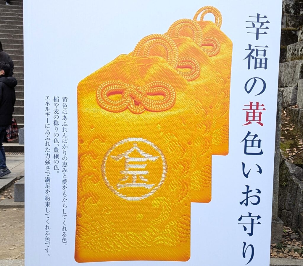 御本宮の授与所で一番に目を引くのが、鮮やかな山吹色の「幸せの黄色いお守り」です。