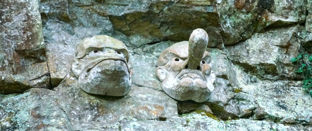 厳魂神社向かって左手は断崖絶壁になっており、この崖を威徳巖(いとくのいわ)と呼ぶのだそうです。この威徳巖の高い位置には、天狗と烏天狗の顔の彫像が、写真の様に鎮座しています。ぜひ探してみてみてくださいね!
